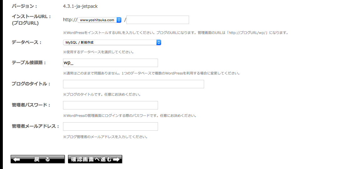 WordPressインストールをクリックすると以下の画面に切り替わります。